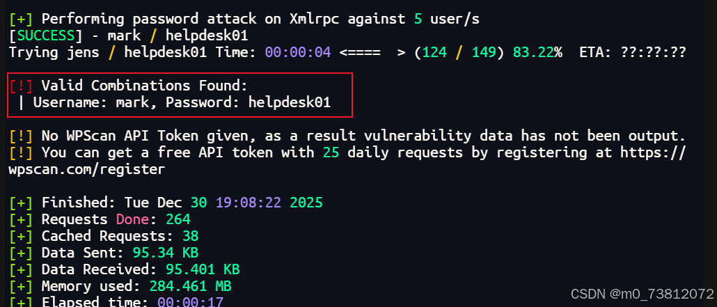 成功得到一些密码,保存为passwds.txt ,然后使用WPScan进行网站登录爆破