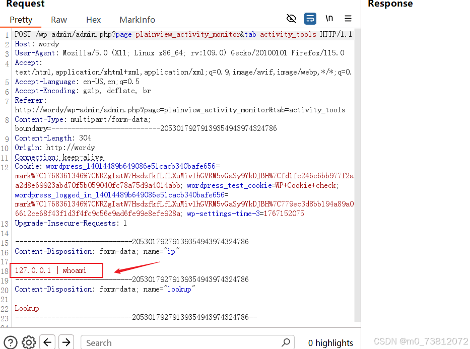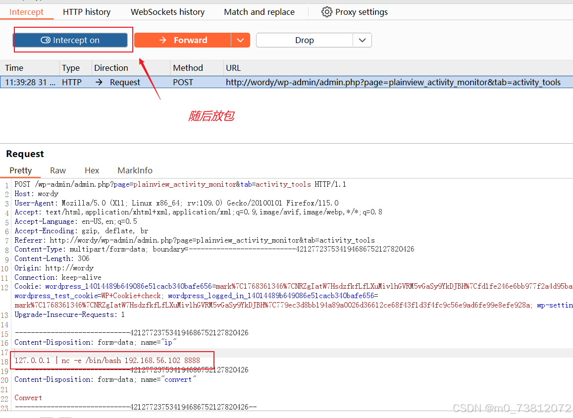 点击Intercept on开启抓包,随后输入命令whoami,放包:
