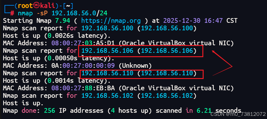 然后我们就对目标网段192.168.56.0/24进行信息收集(因为此时我们不知道目标主机的具体IP地址是什么):
