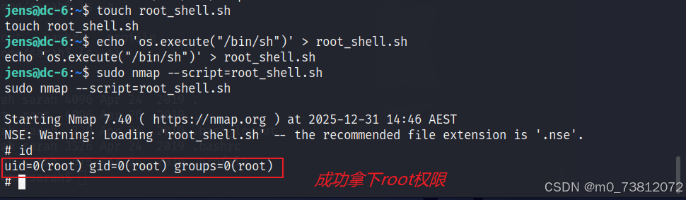 随后还是输入命令sudo -l 成功发现一个以root用户执行的程序:namp