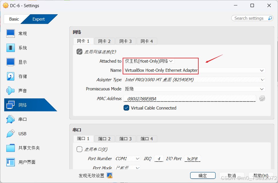 首先我们点击靶机 ---> 选择设置 ---> 网络 ---> 仅主机网络: