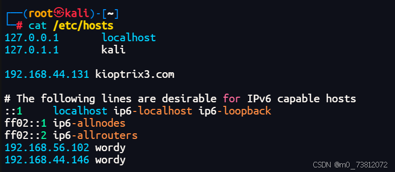 这个时候就需要去kali的/etc/hosts文件去设置一下DNS本地解析: