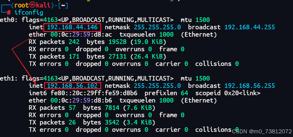 随后我们打开kali,输入命令ifconfig,查看是否配置成功: