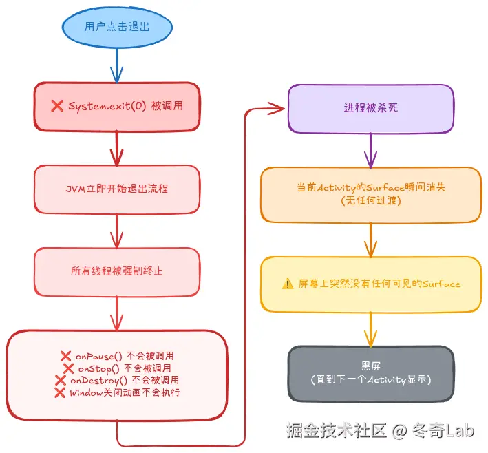 System.exit(0)在Java桌面应用中是"正确"的,但在Android上就是"灾难"。Android有自己的应用生命周期模型,系统会根据需要管理进程的生命周期。作为开发者,我们应该与系统合作,而不是对抗系统。