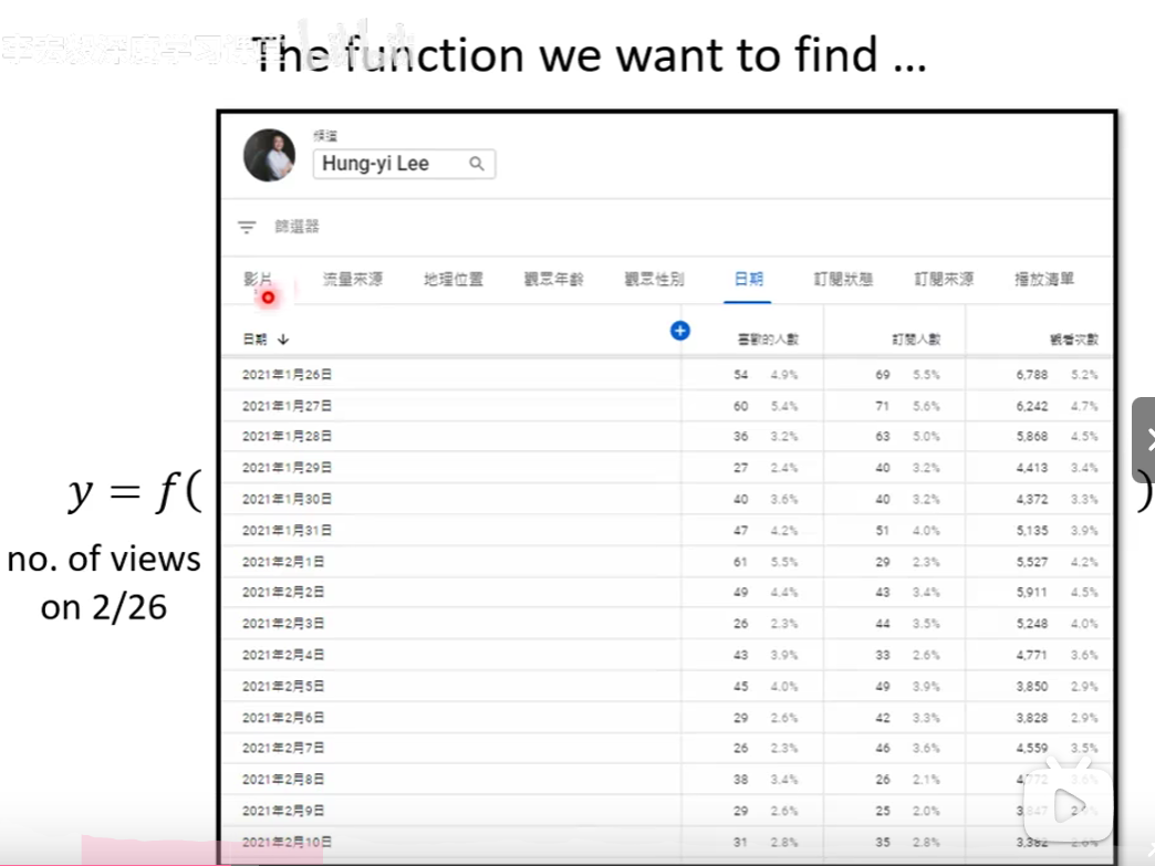 regression:假设要找的范式的输出是一个数值,这样的机器学习任务称为regression