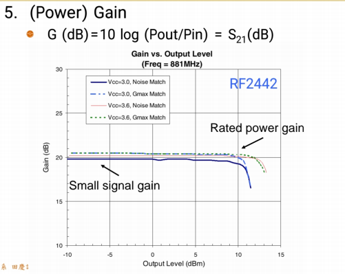 再来看增益 。以F2442放大器为例,其增益就是量测到的S21。当然,这个增益是做完匹配之后 的增益。你需要判断,数据手册是用了哪个参考设计电路(Demo Board,通常需要外加匹配)量测的数据。所以你必须外加匹配才能达到这个增益。