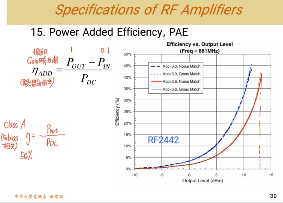 但在实际的数据手册中,我们更看重 功率附加效率(Power Added Efficiency, PAE)。如果没有特别说明,经验上通常展示的都是PAE。这个指标很难做好。