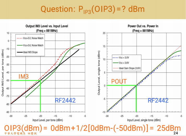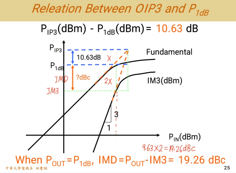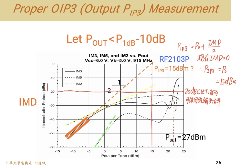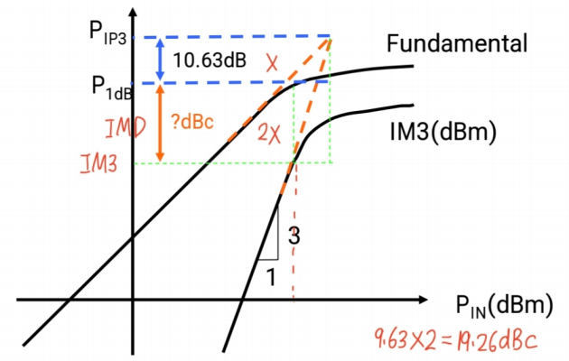看图分析:当IM3等于噪声基底时,对应的主信号输出功率点怎么算?