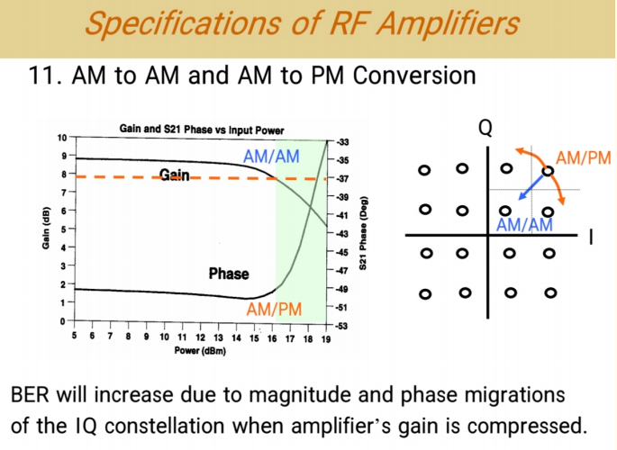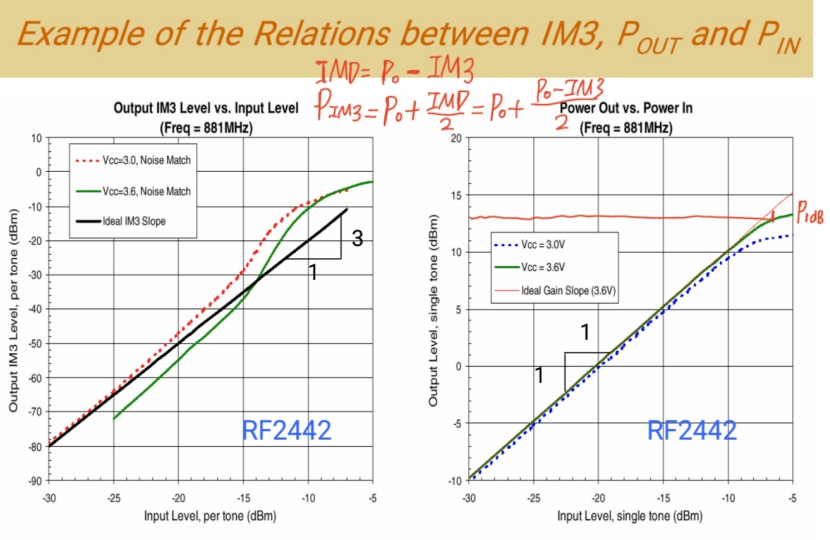 - 同样,IM3在达到一定功率后也被有效抑制,没有按照斜率2快速增长。