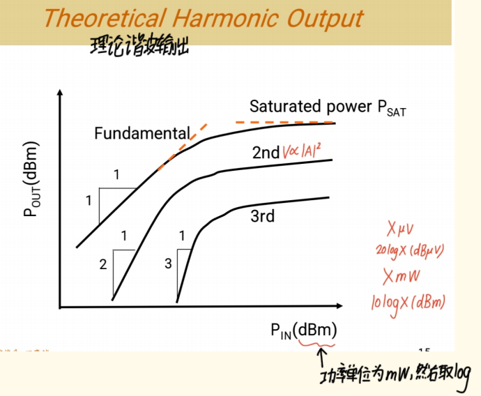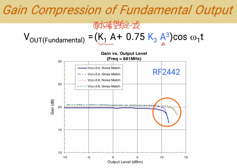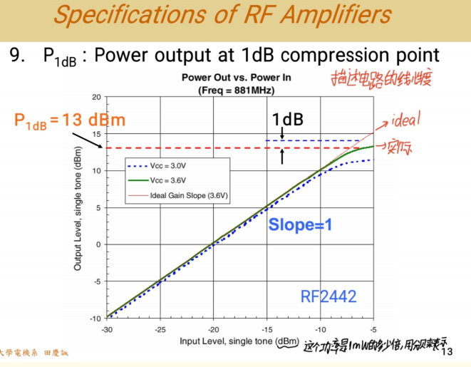 - 输出功率与输入功率的关系图(即P1dB压缩点图)。这种图很常见:纵轴是输出功率,横轴是输入功率。你看这段是线性的,代表线性放大。但到后面"完蛋了",发生了非线性失真。我们定义的 1dB压缩点 就在这里,标示失真开始发生的位置。