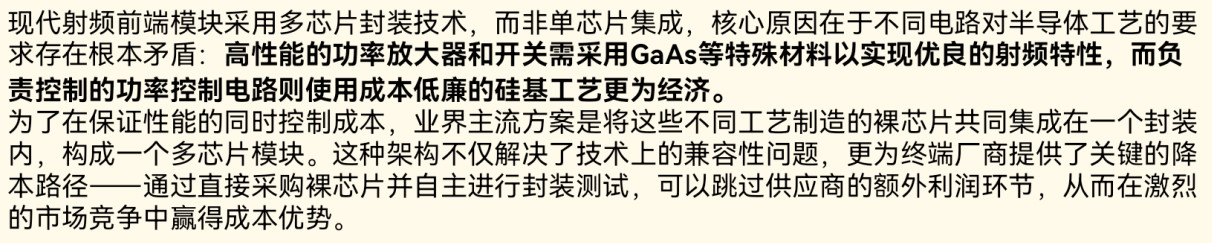 那么,会不会做成单芯片呢?大概也不会。开关和功放本身可以用三五族半导体工艺集成,没有问题。但功率控制器件通常用硅基器件更经济。所以,目前常见的是采用 Chip-on-Board 或 MCM 的架构来实现,即把多个芯片集成在一个基板上。这个基板可以用低温共烧陶瓷、普通PCB板或厚膜技术等多种工艺实现。技术方案有很多种。