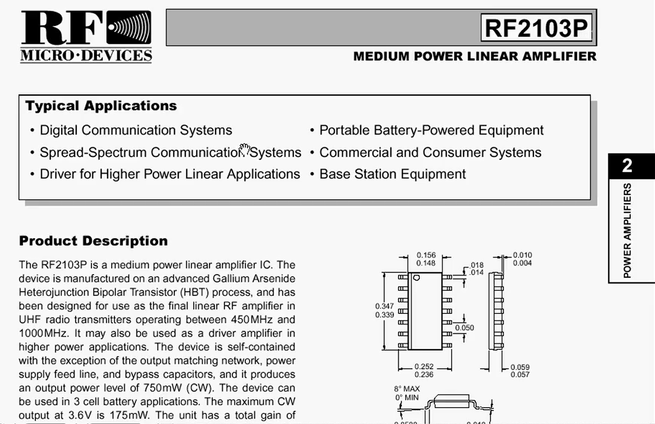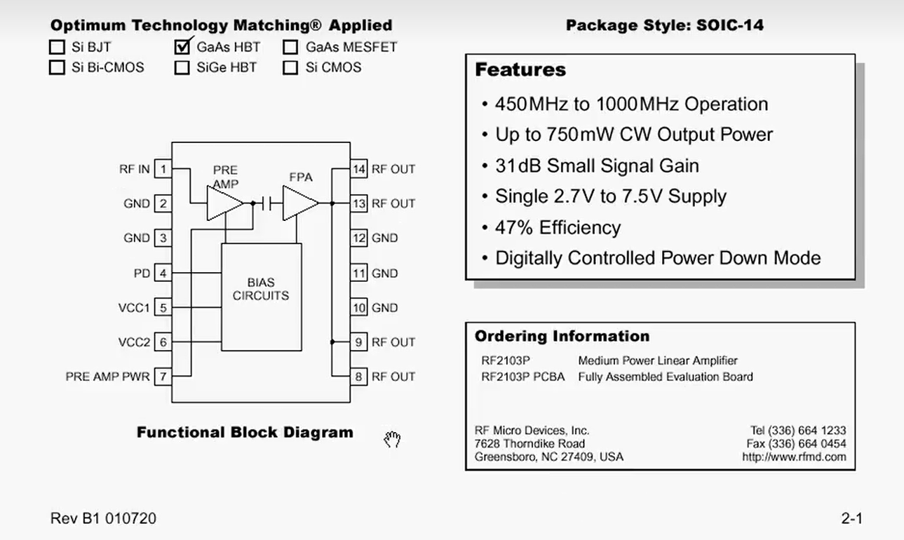 - 工艺:文档说明它是GaAs HBT工艺。这意味着它是基于砷化镓的异质结双极晶体管,通常性能较好但也比较昂贵。看工艺就知道其价格是偏贵的。