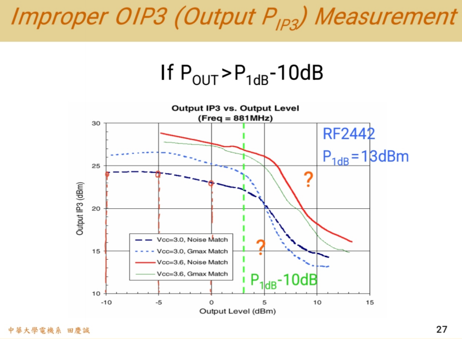 - 如果输出功率太大(超过建议范围),计算出的OIP3会开始下降(不准),这些点应该舍弃。