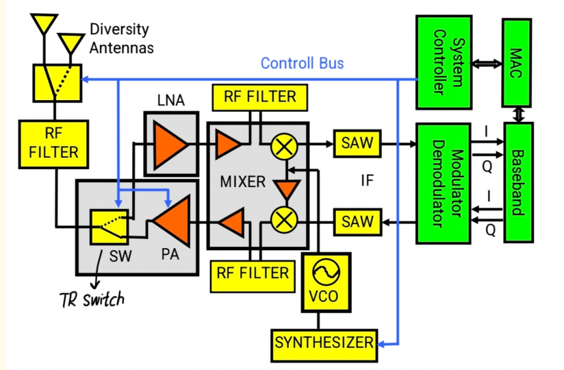 这张图展示的是一个超外差式架构 。我们先从接收路径来看:通常这里会有一个天线开关 ,用于实现天线分集(Diversity Antennas) 。也就是说,两个天线通常会相隔四分之一波长或半波长以上的距离。这样,两个天线同时受到干扰的概率就比较低。系统可以选择哪个天线受干扰较小,一个受到干扰时,另一个通常不会 。这是由基带系统控制器来判定的。