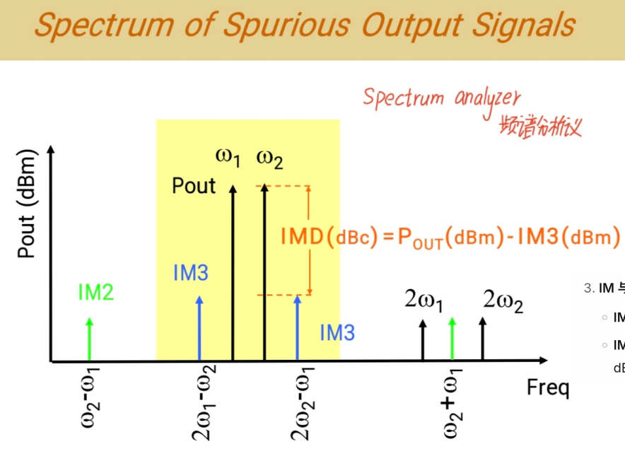- 在线性区,IM3的斜率是 2(符合理论:输入功率每增加1 dB,IMD恶化2dB)。