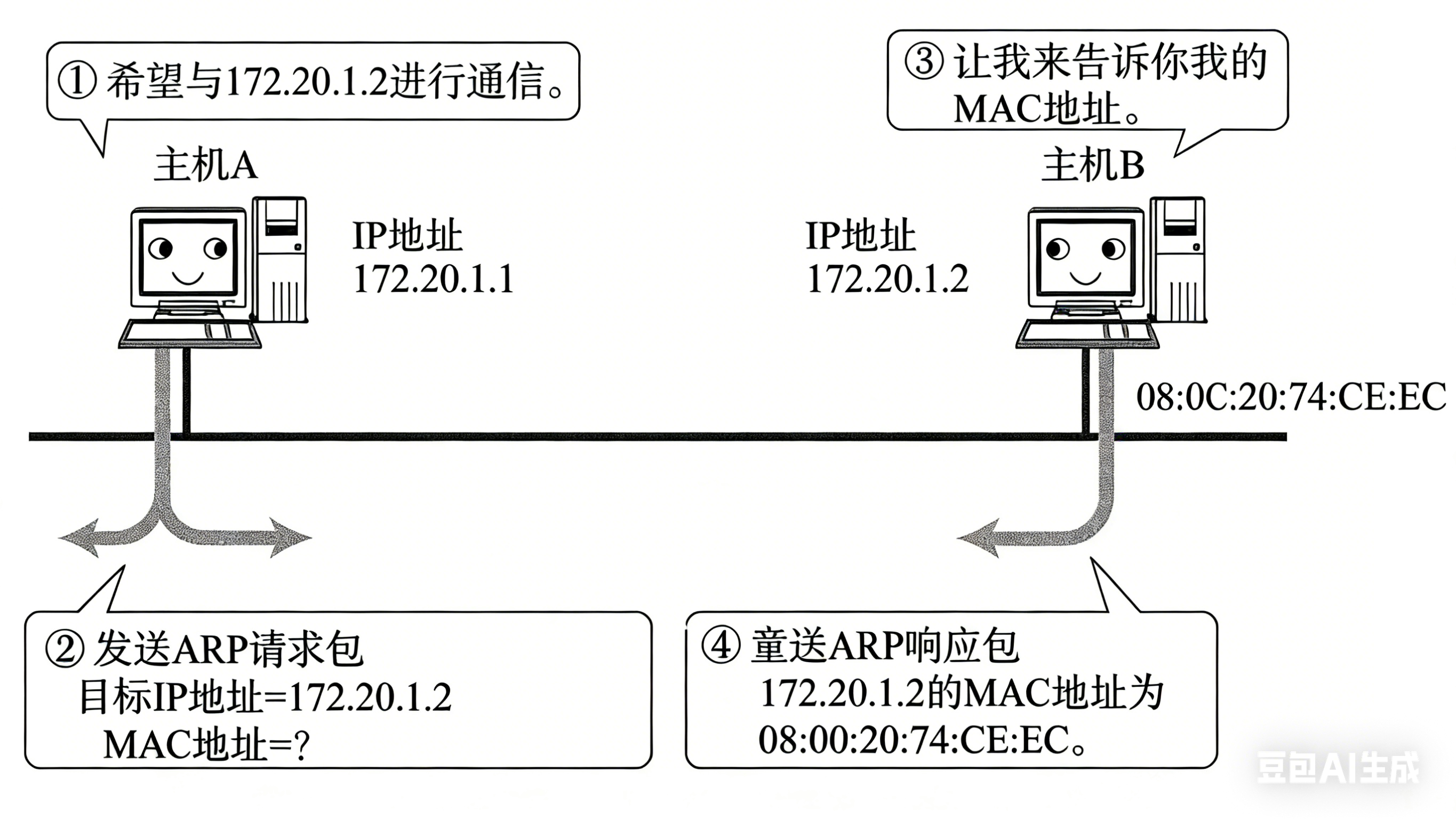 FF:FF:FF:FF:FF:FF(广播地址,代表 "发给本地网段所有主机"); - ARP 请求包的内容是:"谁是 172.20.1.2?请把你的 MAC 地址告诉我!"(同时带上 A 自己的 IP 和 MAC)。