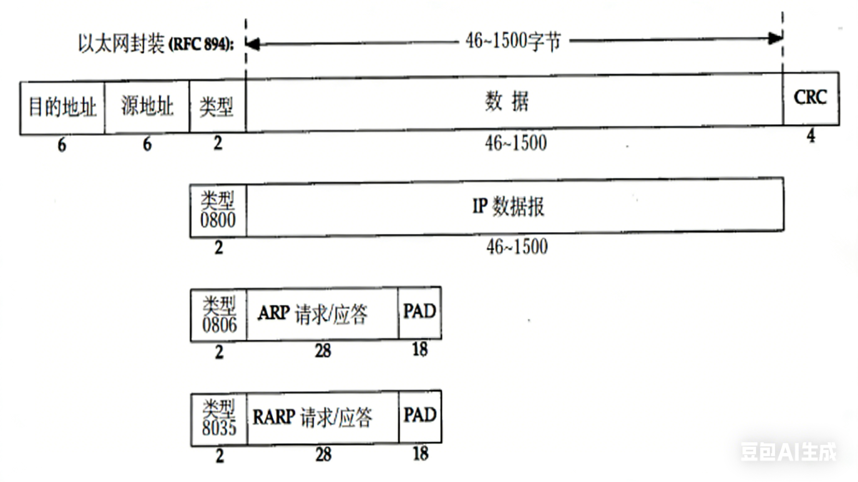 - 关键规则:以太网要求 "数据部分至少 46 字节"------ 如果上层报文本身长度不足(比如 ARP 报文只有 28 字节),会添加PAD(填充字段) 凑够 46 字节。