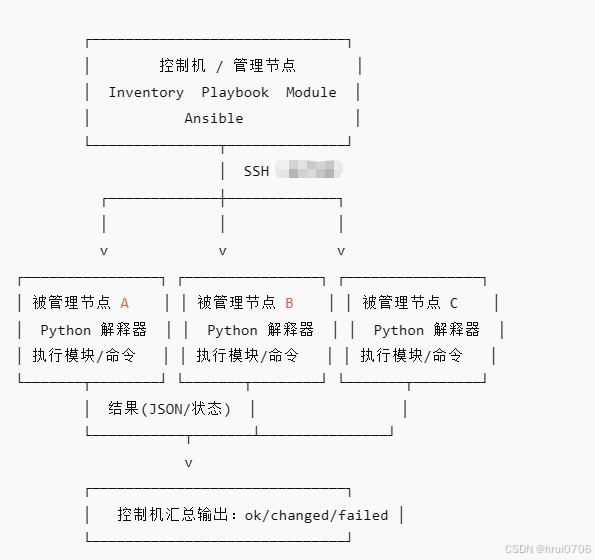 无代理:不用在被控机器装 agent,通常 SSH 就行