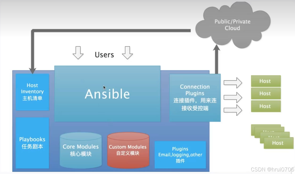 Ansible去主机清单中找对应的机子,通过连接插件建立连接,然后(通过核心模块,自定义模块,插件)去完成