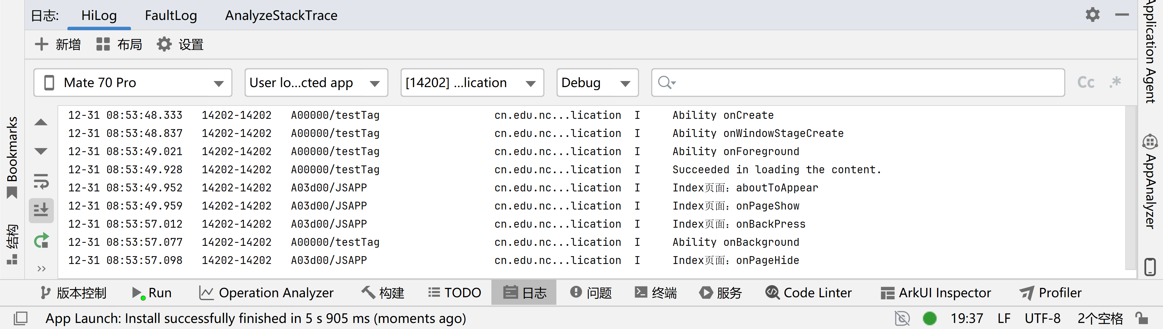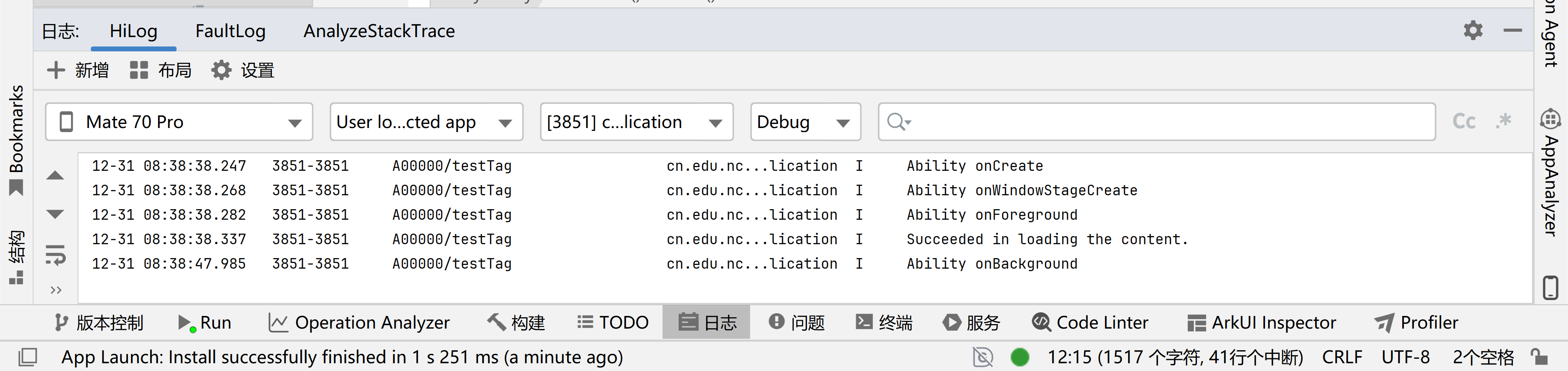 测试上述的UIAbility,启动应用,并从后退按钮,将应用进入后台,注意此时,应用并没有关闭。运行的日志如图2所示:
