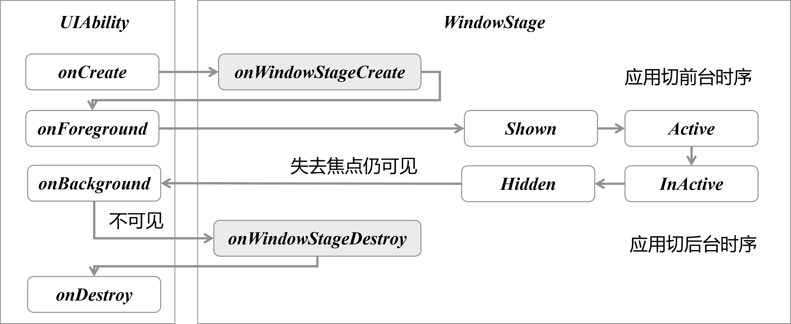 CREATE (& WINDOW_STAGE_CREATE) :UIAbility被创建,其 UI 窗口已设置好,准备显示。