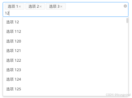 没找到合适的自带虚拟列表的下拉选择框,所以这里我基于vue-virtual-scroller和vue-select封装了一个选择框,功能样式都参考antd-select,支持多选/单选/清除/搜索功能。