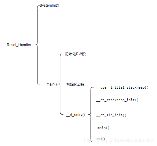 紧接在后面的是中断向量表,排在第一个的是复位中断处理函数Reset_Handler,PC指针会指向这里,运行这个中断处理函数,默认的Reset_Handler函数会导入SystemInit 和__main两个函数。