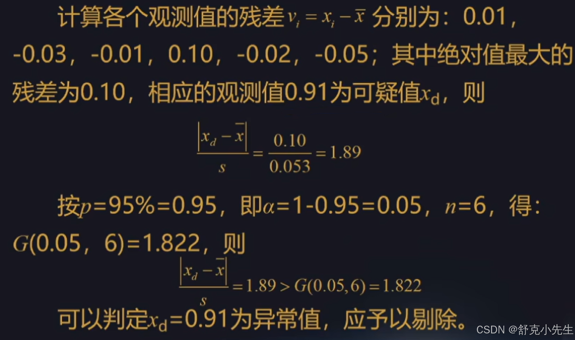 ,当给定的包含概率为p=0.99或p=0.95,也就是显著性水平α=1-p(即α为0.1或0.05)时,如果满足下式,可以判定 为异常值。