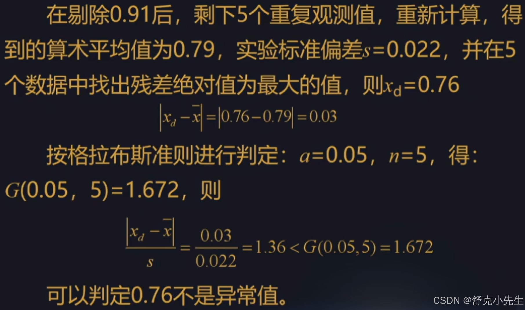 如果一系列测量值中混有异常值,必然会歪曲测量的结果,这时若能将该值剔除,可使结果更符合客观情况。但不能无原则地剔除,损失了测得值的随机波动特性,数据失真。所以必须正确地判断和剔除异常值。