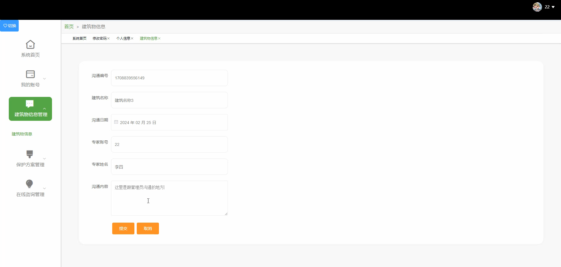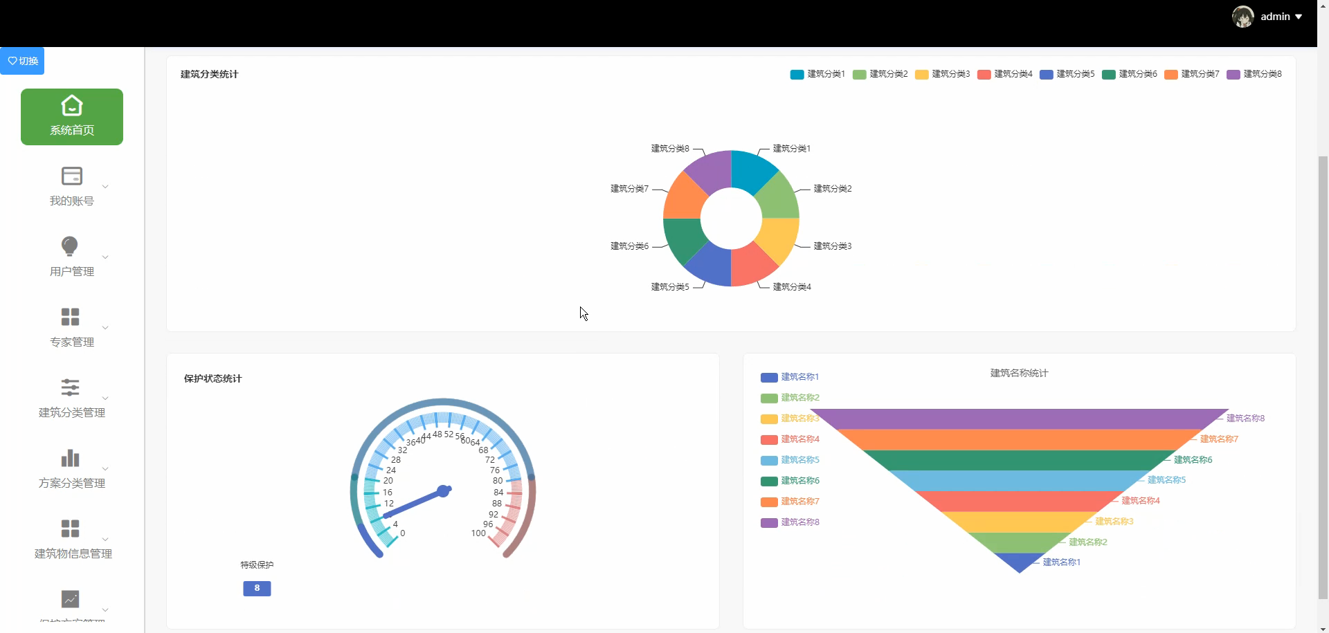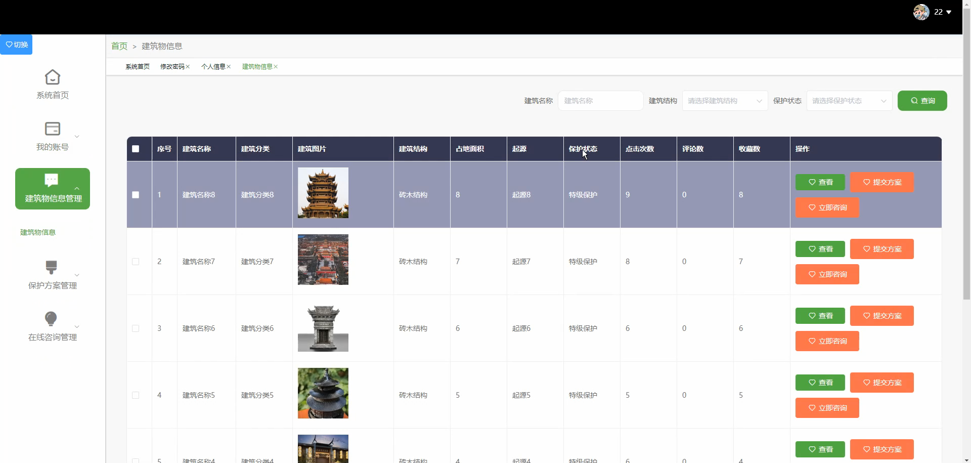 - 建筑基础信息管理:录入/编辑建筑信息(基础属性:名称、年代、结构类型、地址;文化属性:历史背景、保护级别;现状属性:病害类型、保护状态),支持上传图片、三维模型文件(如OBJ格式),实现"一建筑一档案"。