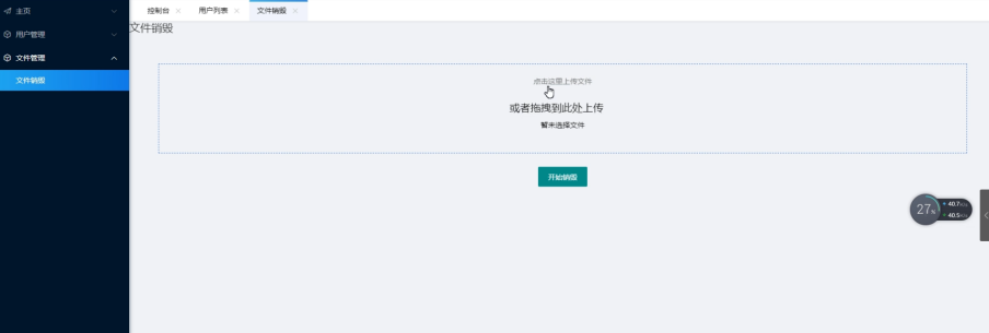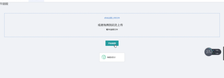 在文件销毁的界面中可以看到在主页面中有着"点击上传文件"和"或者拖拽文件到此处"的字样,通过该模块的设计可以 将文件的销毁上传方式做到更加的灵活。