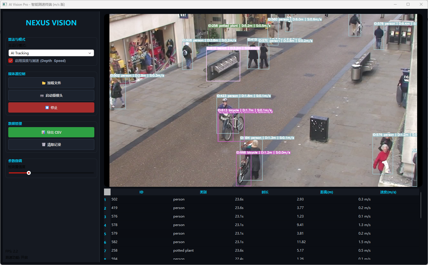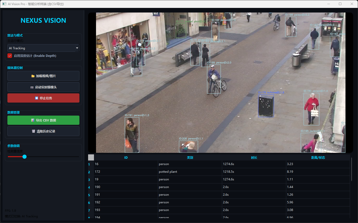 在此模式下,画面左上角实时显示检测框、ID号以及通过 API 获取的深度距离值。右侧表格同步刷新目标状态。