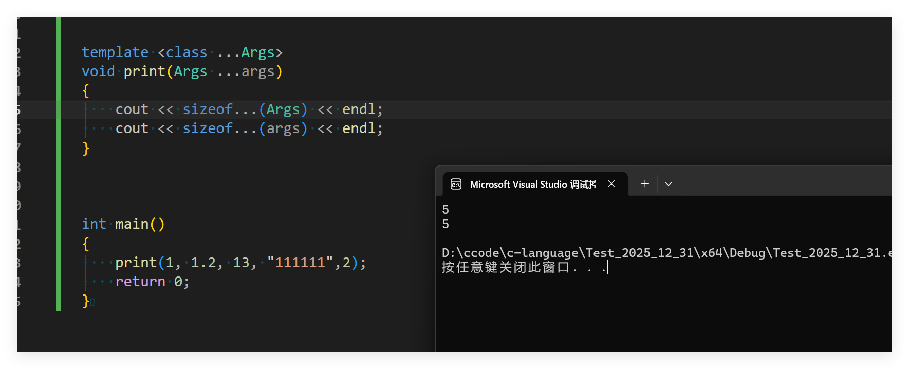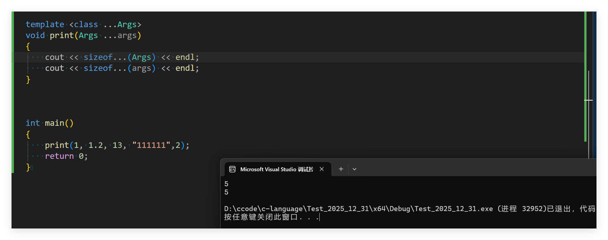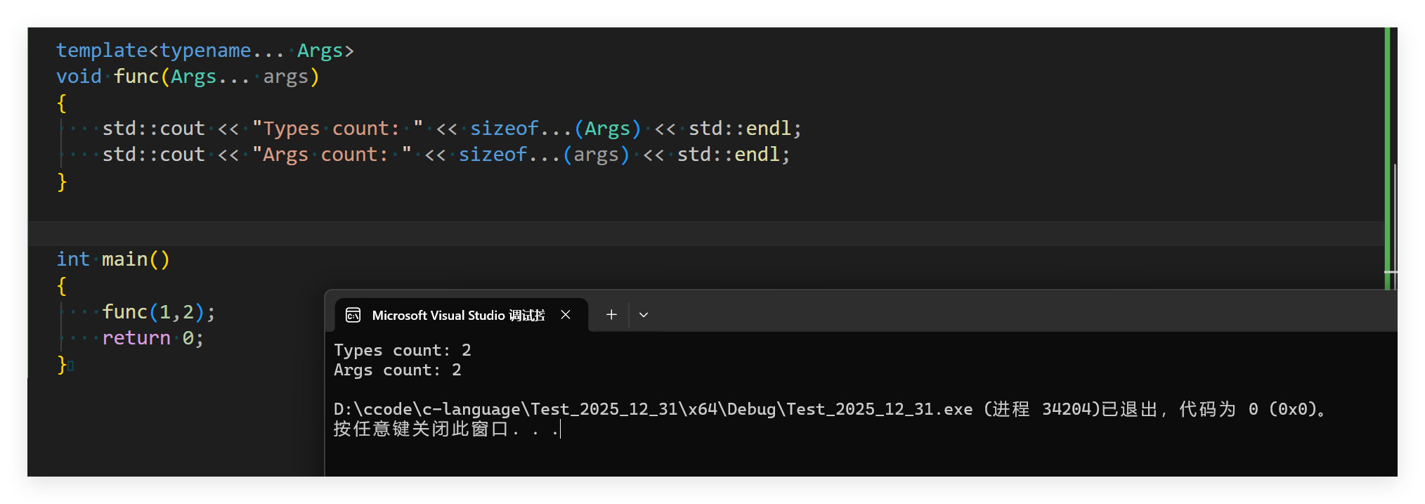 这里就完成了对模板参数的统计,需要注意的是... 需要放在指定的位置,才能编译通过完成运行。