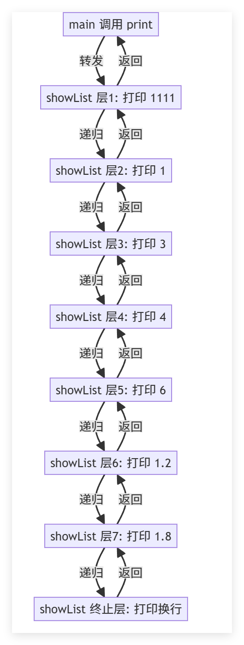 内部逻辑:打印 1.8,然后调用下一层。注意!此时调用的是 showList(),也就是没有参数的那个版本。 - 最后匹配: