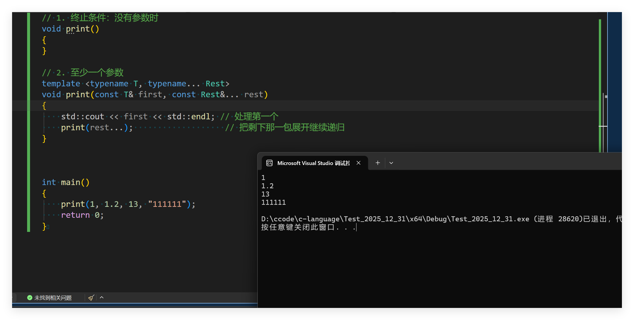 发现一切打印正常完成,此时完美的打印了每一个数据。如果不使用这个技巧,可能会导致写很多函数。有了这个他会自动帮你生成。同时我们发现这个调用很类似与递归的调用,最后有一个简单的递归终止条件。这里的 Rest 是一个模板参数包,rest 是函数参数包;rest... 表示把"剩下的那包参数全部展开传给下一层"。