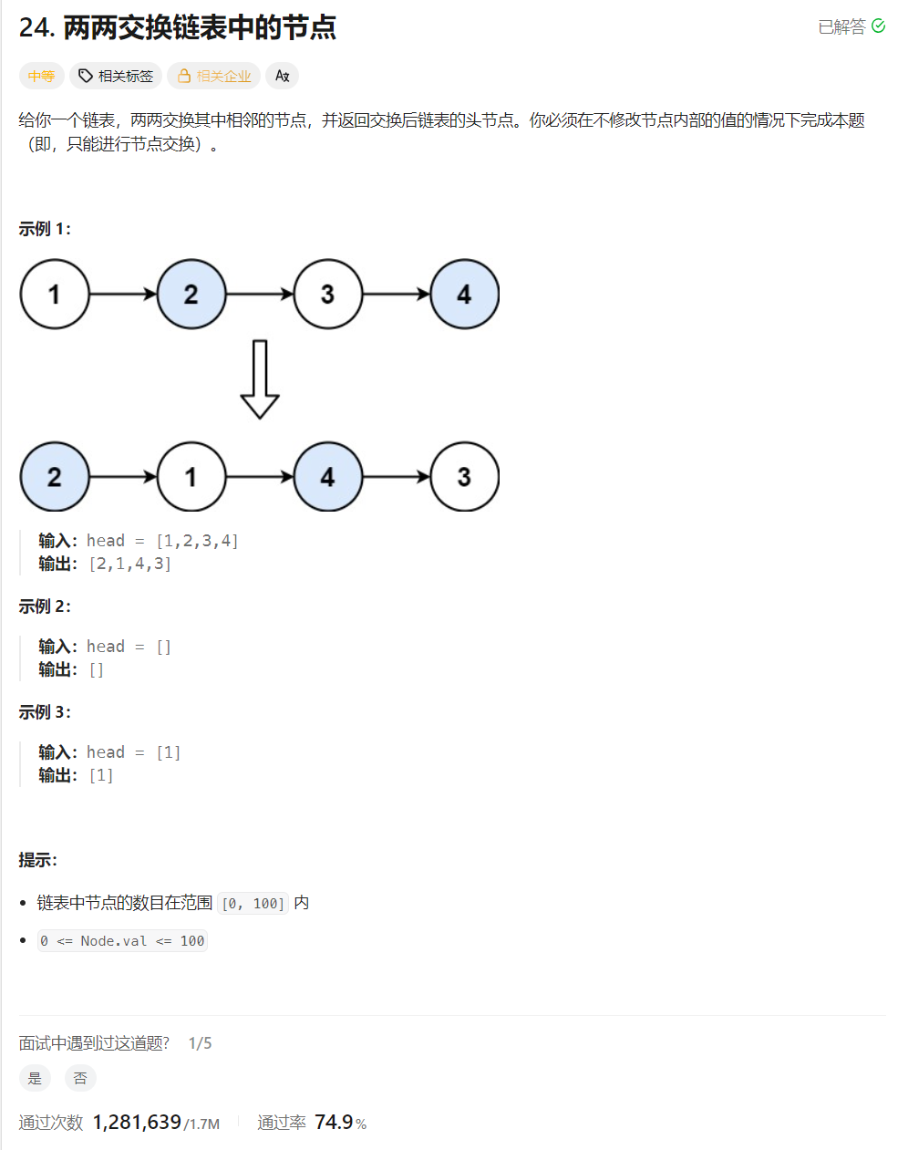 if(swapnode) swapnode->next = cur;//第二次,两两交换时,要把 prev 前一个结点链接上交换后的 cur