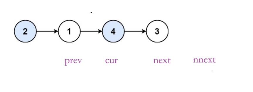 prev 的 next 要指向 cur ,所以引入哨兵位,这样一次循环就能搞定交换两两结点;这里我为什么要引入 nnext ?其实是为了方便对两个结点时的交换。