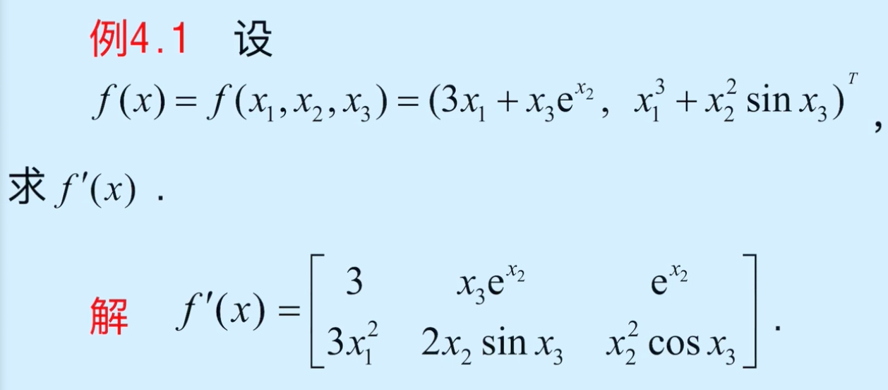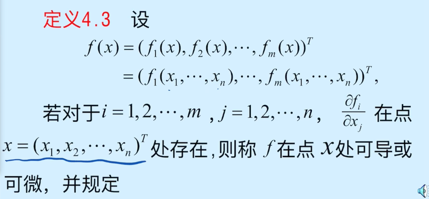 它在点 x = ( x 1 , x 2 , ⋯ , x n ) T x=(x_1,x_2,\cdots,x_n)^T x=(x1,x2,⋯,xn)T 处的导数为 n n n 维向量