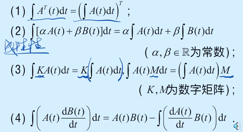 ∫ a b A ( t ) d t = [ ∫ a b a i j ( t ) d t ] m × n ; \int_{a}^{b} A(t) \mathrm{d}t = \left[ \int_{a}^{b} a_{ij}(t) \mathrm{d}t \right]_{m \times n} ; ∫abA(t)dt=[∫abaij(t)dt]m×n;
