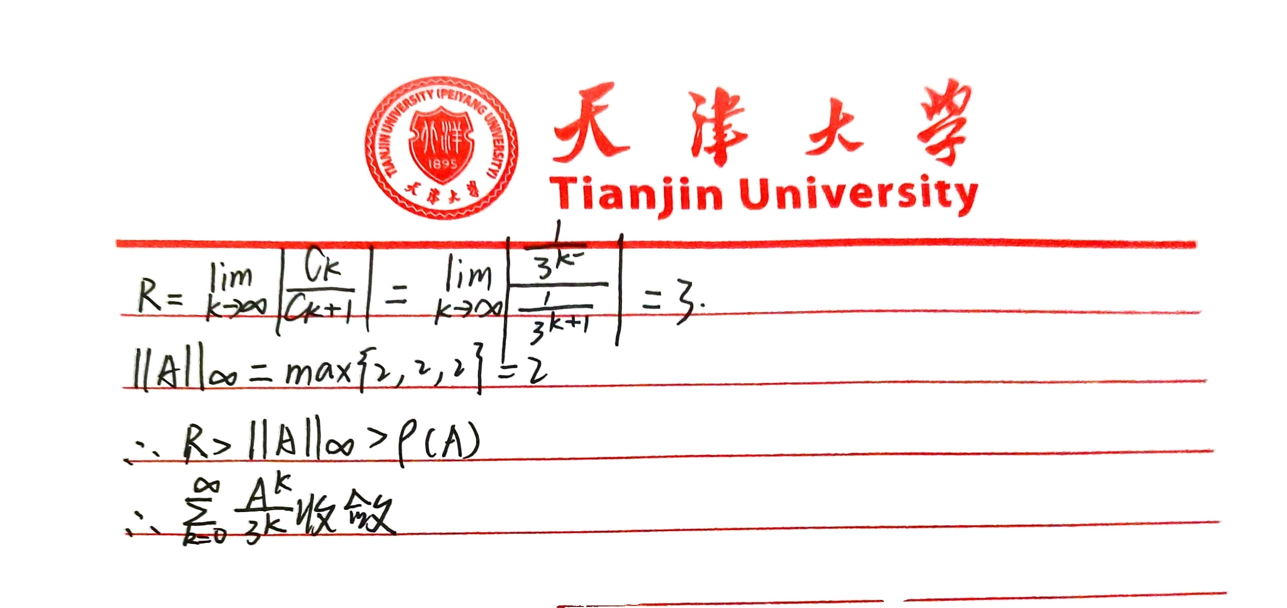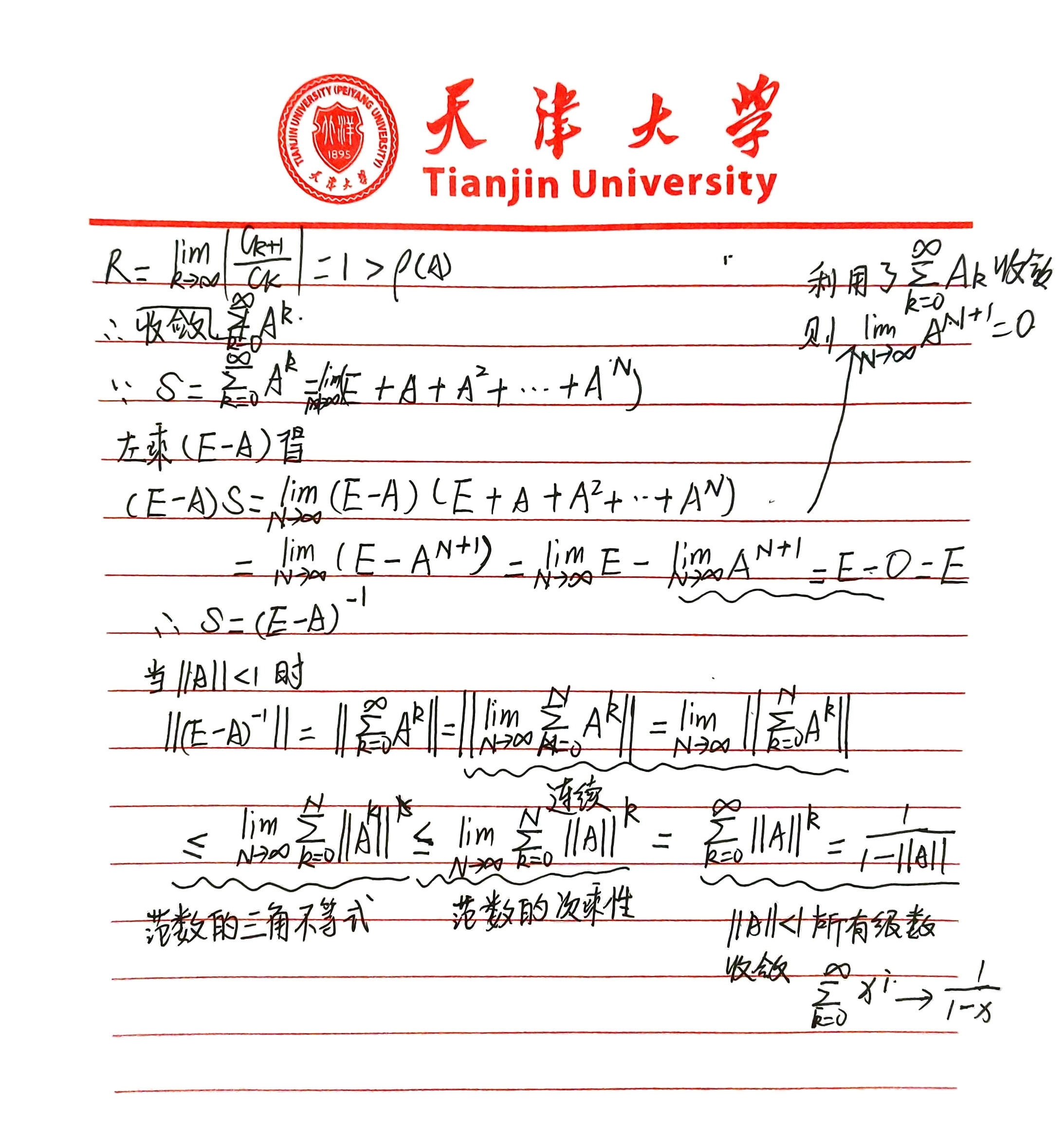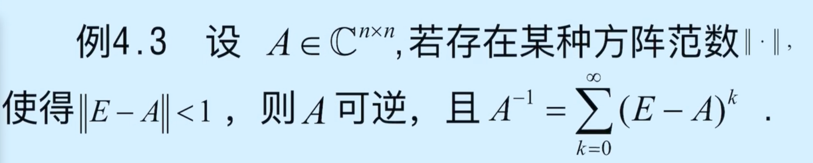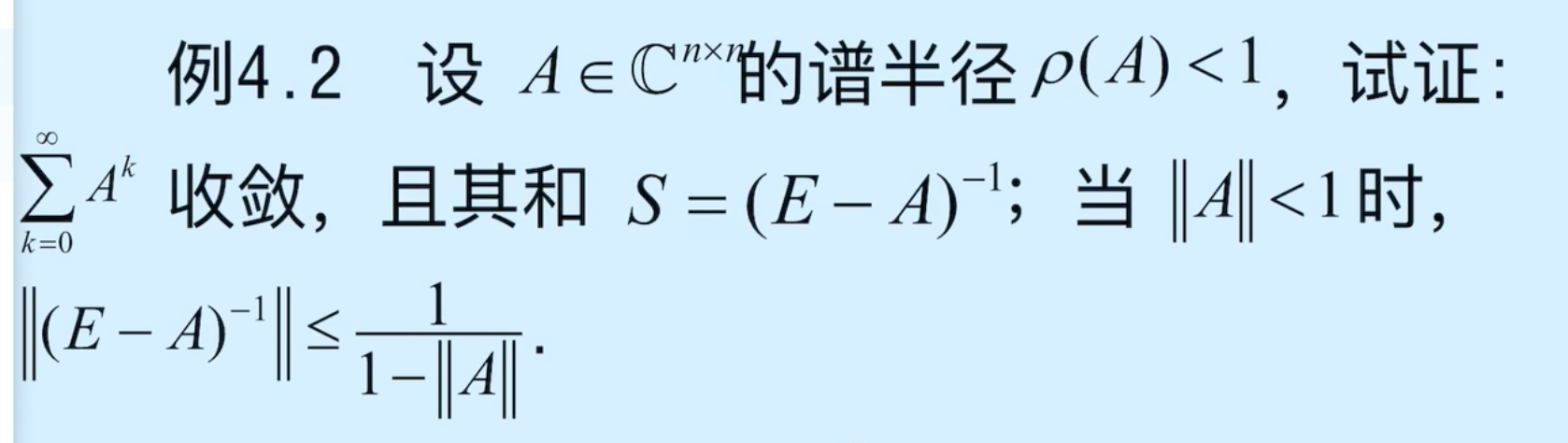 这道题目本质上和上面的题目是一样的,令 B = E − A B=E-A B=E−A,就可以得到 ∥ B ∥ < 1 \|B\|<1 ∥B∥<1,那么 ρ ( B ) < 1 \rho(B) < 1 ρ(B)<1,所以幂级数收敛