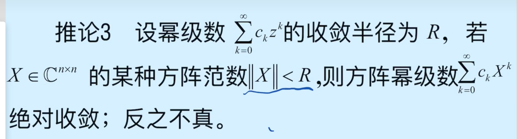 设幂级数 ∑ k = 0 ∞ c k z k \sum_{k=0}^{\infty}c_kz^k ∑k=0∞ckzk 的收敛半径为 R R R, X ∈ C n × n X \in \mathbb{C}^{n \times n} X∈Cn×n 的谱半径为 ρ ( X ) \rho(X) ρ(X),则