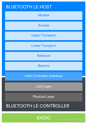 - 蓝牙网状设备同样包含蓝牙 LE 控制器,但其主机部分会集成蓝牙网状网络协议栈的各层。图 1b 展示了蓝牙网状网络协议栈。