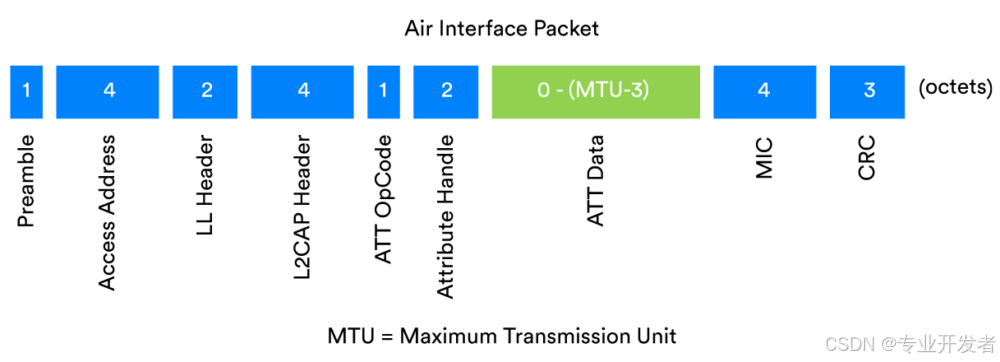 蓝牙 LE 数据包可以被加密。所有加密数据包都包含一个名为 "消息完整性码(MIC)" 的字段。实际上,MIC 属于消息认证码,但由于缩写 "MAC" 在通信领域有其他用途,因此蓝牙规范中使用 "MIC" 这一术语。