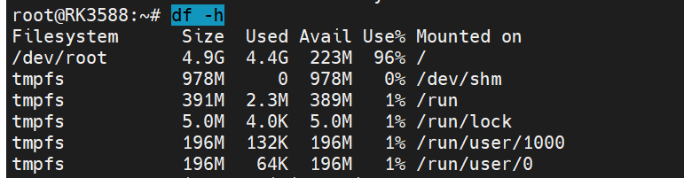 - 遇到的problem:在使用过程中,我发现根文件系统占用emmc的存储空间只有4.9G,而我的emmc是16G的,但显然很多空间没有被使用!此时我已经完成"3 需要在启动时更改分区,对mmcblk1p6分区进行扩容"这步操作,问题依旧存在!