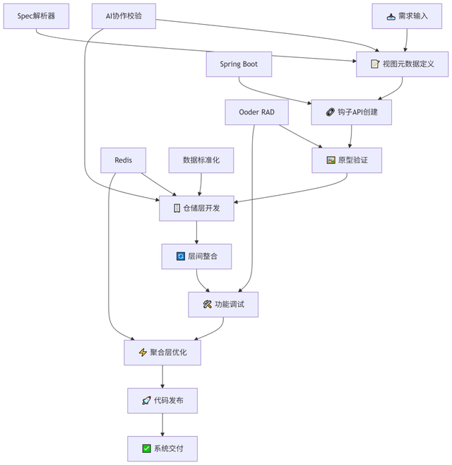 这些问题并非个例,而是《AI Coding 生死局》等行业博文反复提及的共性困局。为了破局,我们没有硬套理论框架,而是基于Ooder框架(注解驱动的企业级全栈开发框架),在实战中沉淀出8步实施法(视图元数据定义→钩子API创建→原型验证→仓储层开发→层间整合→功能调试→聚合层优化→代码发布)。核心思路很简单:用工程化的确定性,对冲AI开发的不确定性。