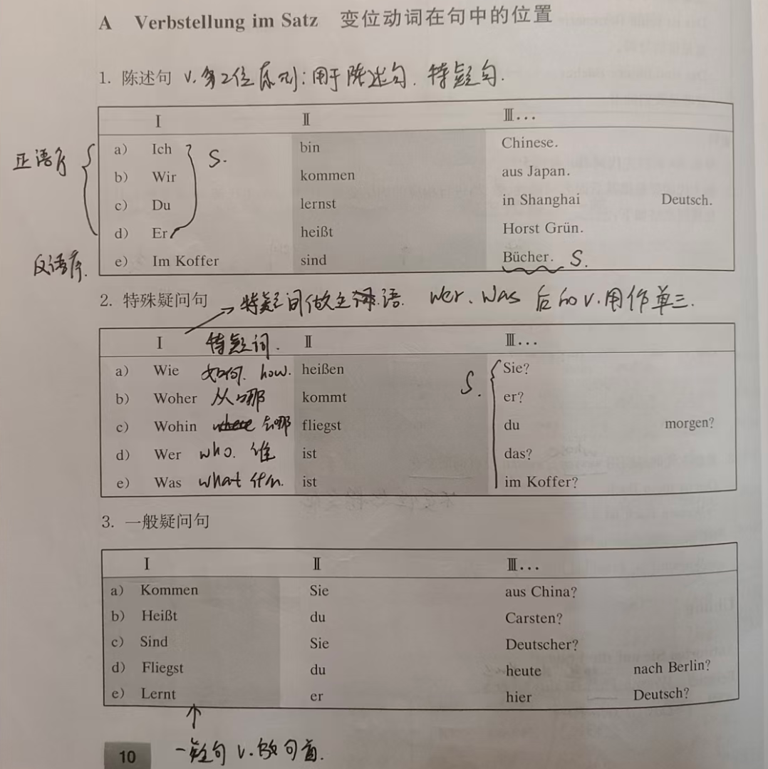 - Inverted Statement (emphasize something): Emphasized word + Verb + Subject + ... (e.g., Im Koffer sind Bücher. = In the bag are books.)