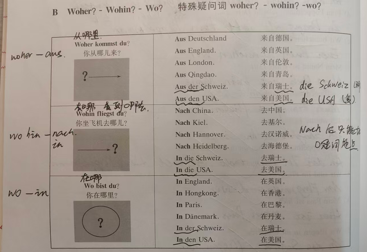 | woher | where from | Woher kommst du? (Where are you from?) |