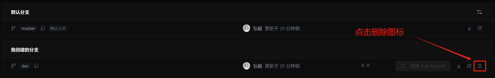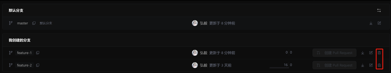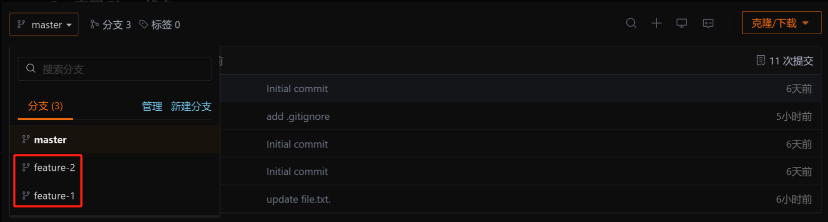 此时,feature-1、feature-2分支对于我们来说就没用了,那么我们可以直接在远程仓库中将其删除掉