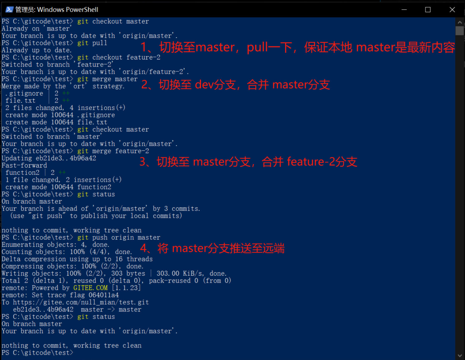 # 1、由于 feature-1分支已经 merge进来了新内容,为了保证远程分支最新,所以最好 push 一下。